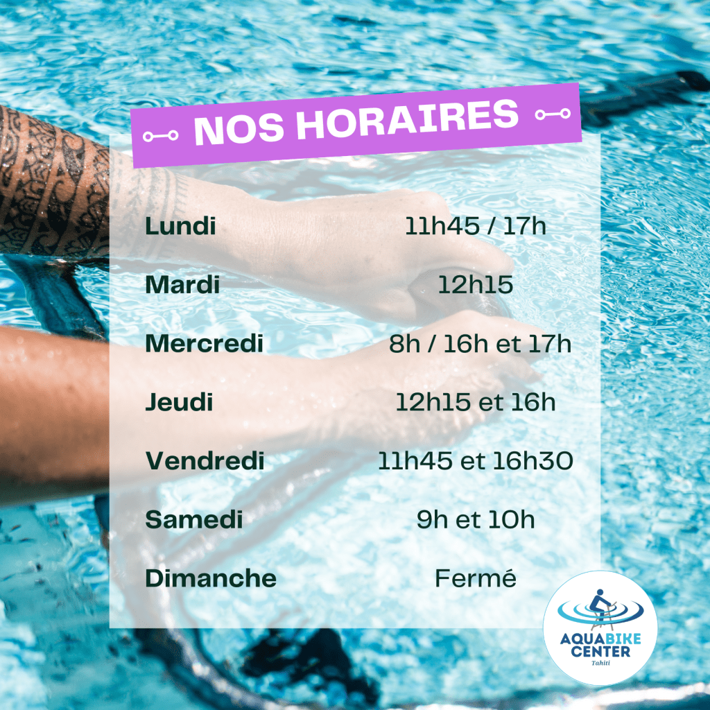 Situés dans la piscine du complexe sportif de l’OPT à Pirae, nous proposons 12 cours d’aquabike par semaine du lundi au samedi. Ouvert à tous, débutants ou adeptes réguliers, nos coaches vous proposent leur expertise pour un cours de 45 minutes varié et complet.